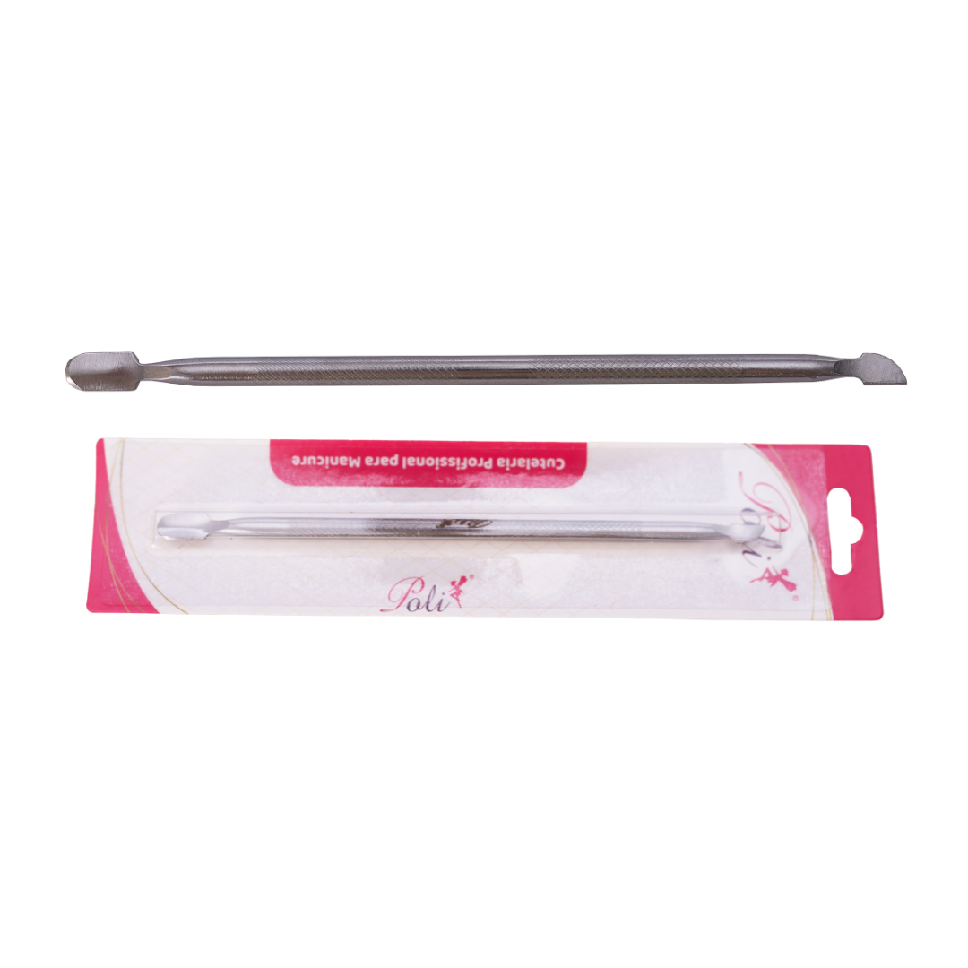 A espátula para cutícula é feita em aço inox e possui dois lados, um para empurrar a cutícula e o outro para limpar e finalizar as unhas.