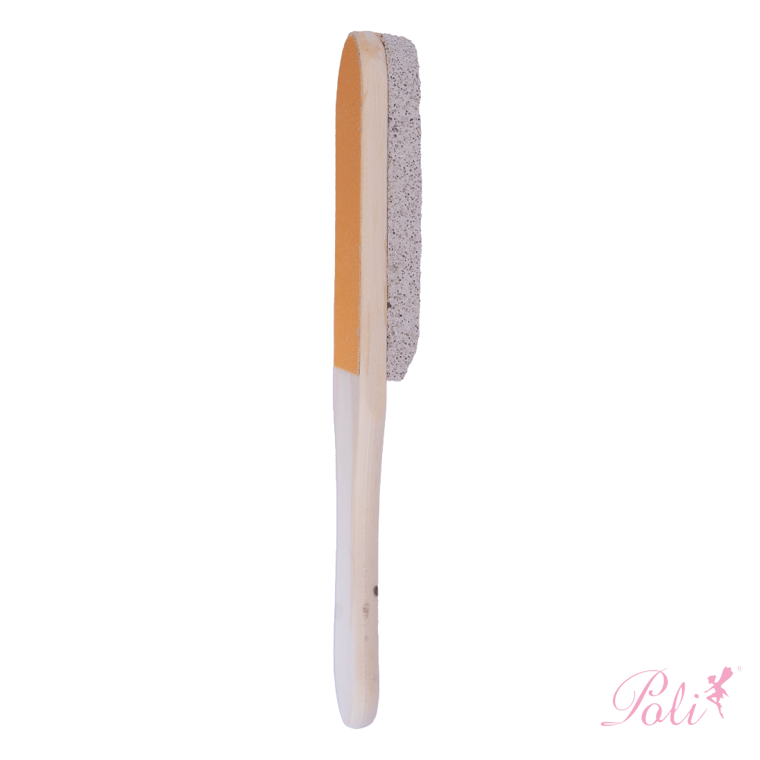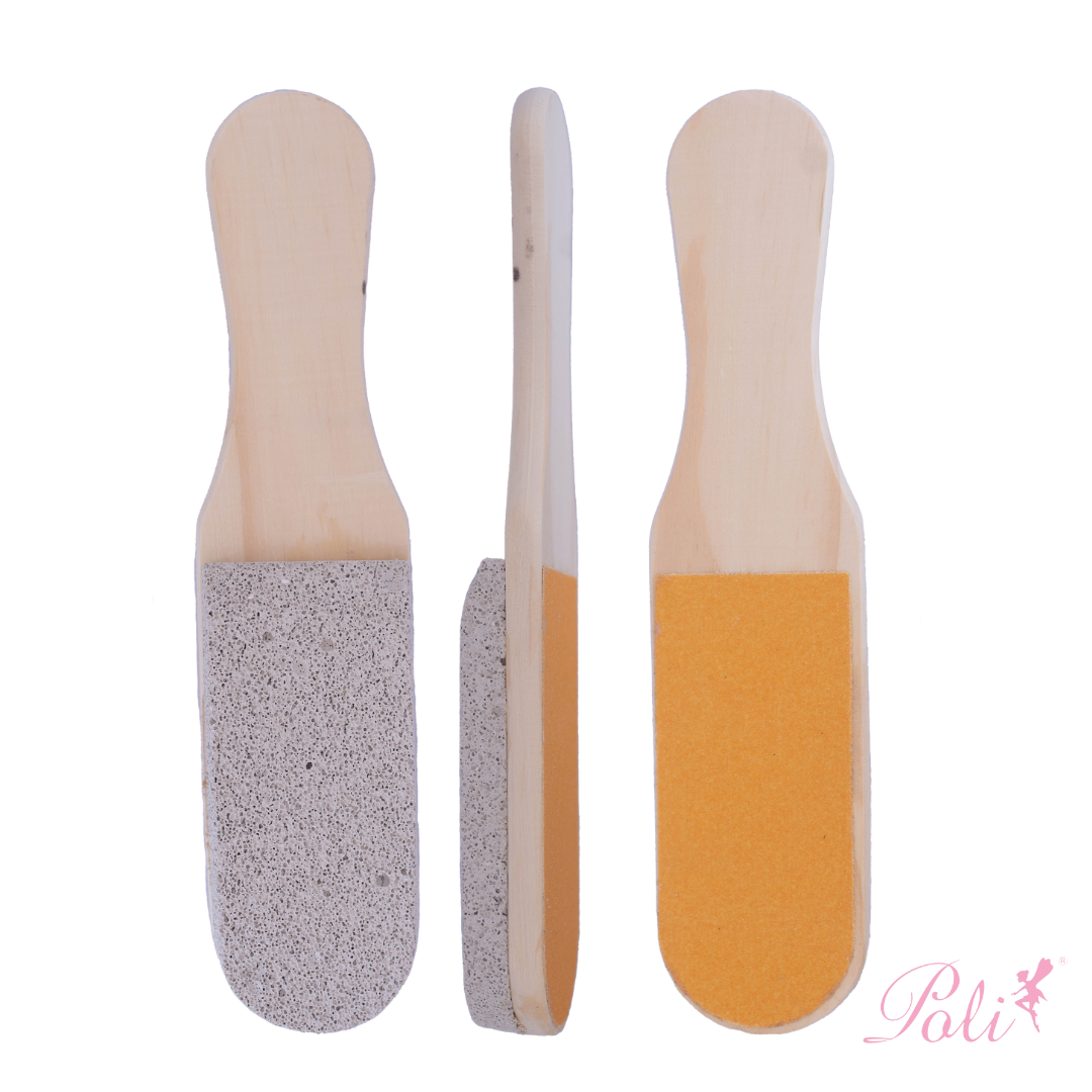 Lixa pé Romeu e Julieta com pedra – 1 unidade. Dupla ação: madeira e pedra-pomes. Remove calos e rachaduras. Pés macios profissionalmente.