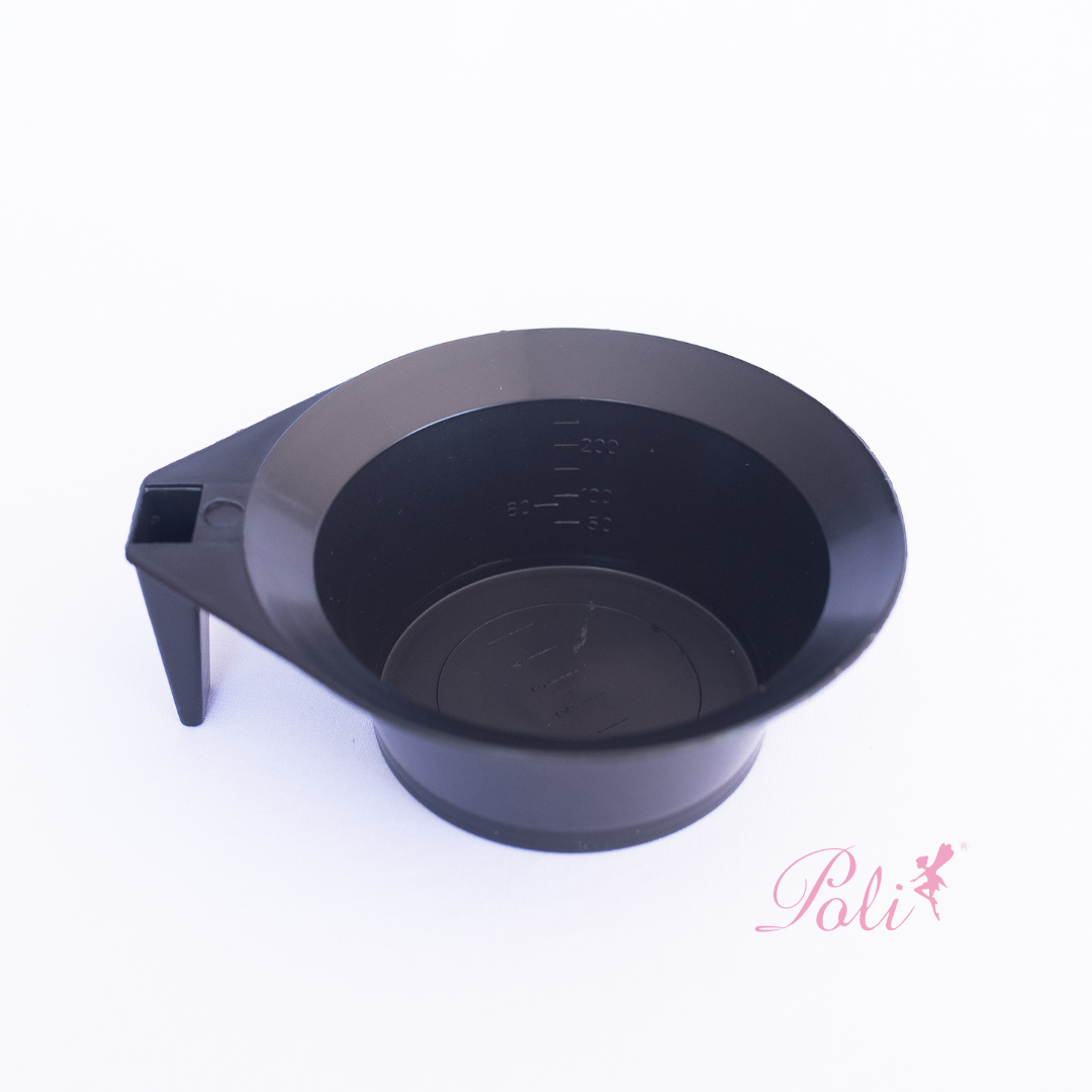 Tigela tintura graduada preta com alça – 1 unidade. Medidor integrado para misturas precisas. Suporte para pincel. Profissional e prática.