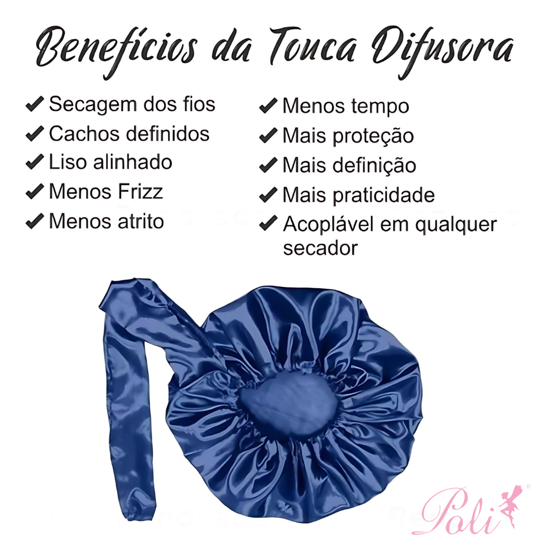 Produto confeccionado em Cetim liso, permite que o ar do secador penetre uniformemente, diminuindo o período de contato dos fios com o calor evitando o efeito frizz no cabelo. Para cabelos cacheados ou em transição.